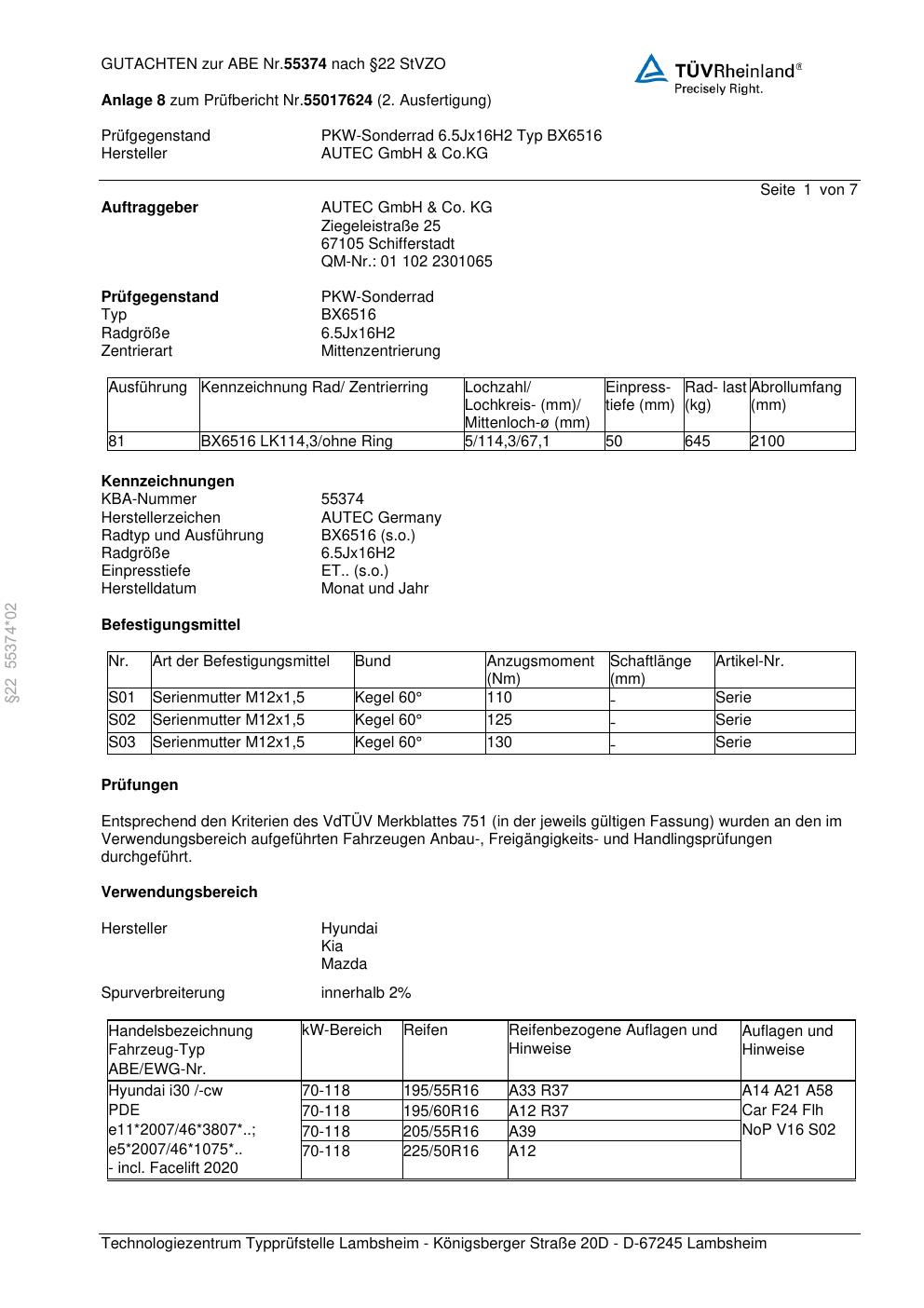 Dieses Gutachten (abe) bezieht sich auf die Alufelge Autec BX6516 in der Ausführung 6.5Jx16 ET 0, Mittenloch 0 mm (KBA 55374). Im PDF findest du typischerweise zulässige Reifengrößen, Auflagen/Anbauhinweise und – je nach Dokument – Hinweise zur Eintragung.