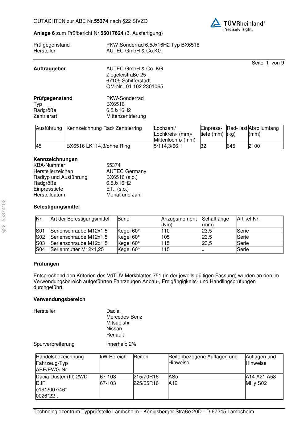 Dieses Gutachten (abe) bezieht sich auf die Alufelge Autec BX6516 in der Ausführung 6.5Jx16 ET 0, Mittenloch 0 mm (KBA 55374). Im PDF findest du typischerweise zulässige Reifengrößen, Auflagen/Anbauhinweise und – je nach Dokument – Hinweise zur Eintragung.