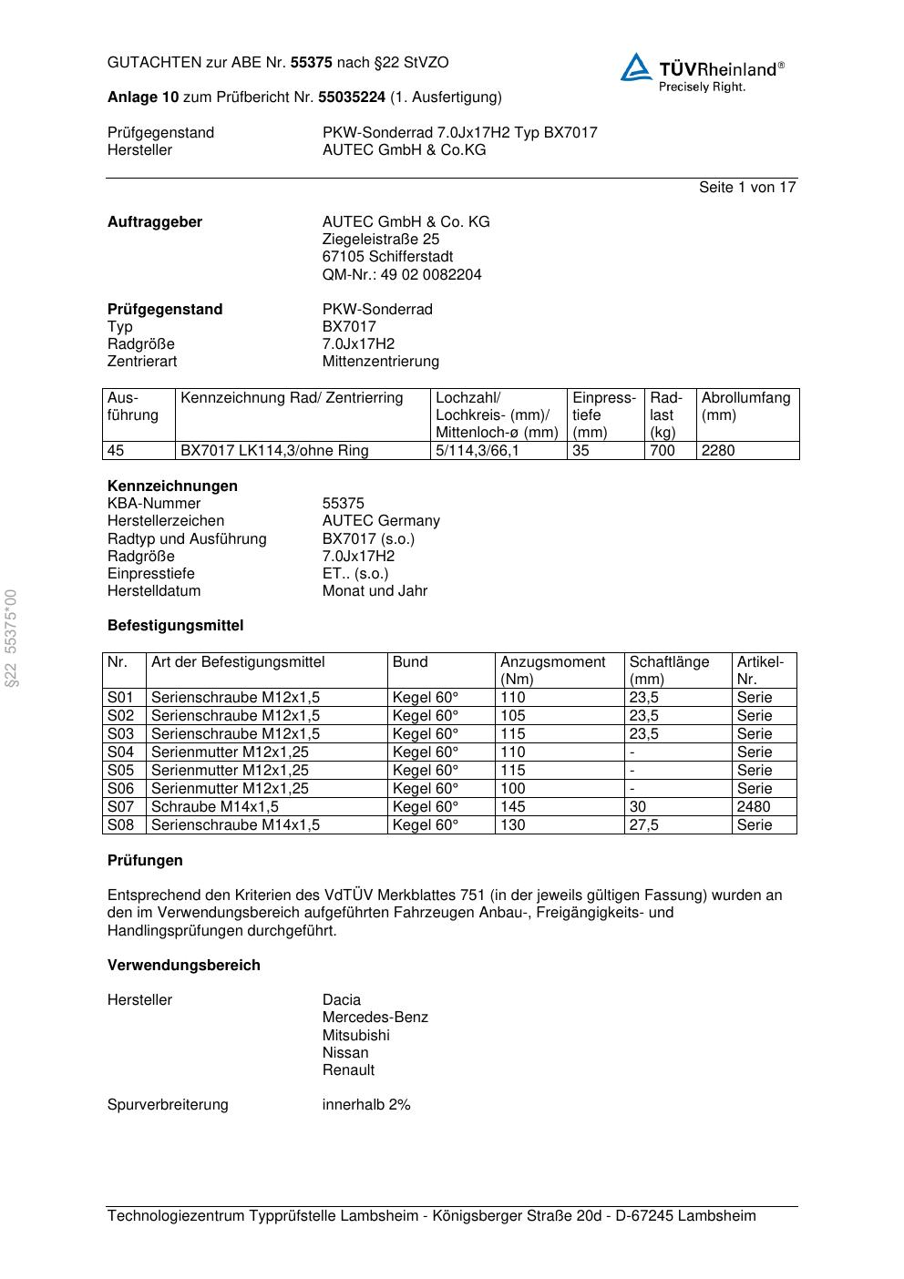 Dieses Gutachten (abe) bezieht sich auf die Alufelge Autec BX7017 in der Ausführung 7Jx17 ET 0, Mittenloch 0 mm (KBA 55375). Im PDF findest du typischerweise zulässige Reifengrößen, Auflagen/Anbauhinweise und – je nach Dokument – Hinweise zur Eintragung.