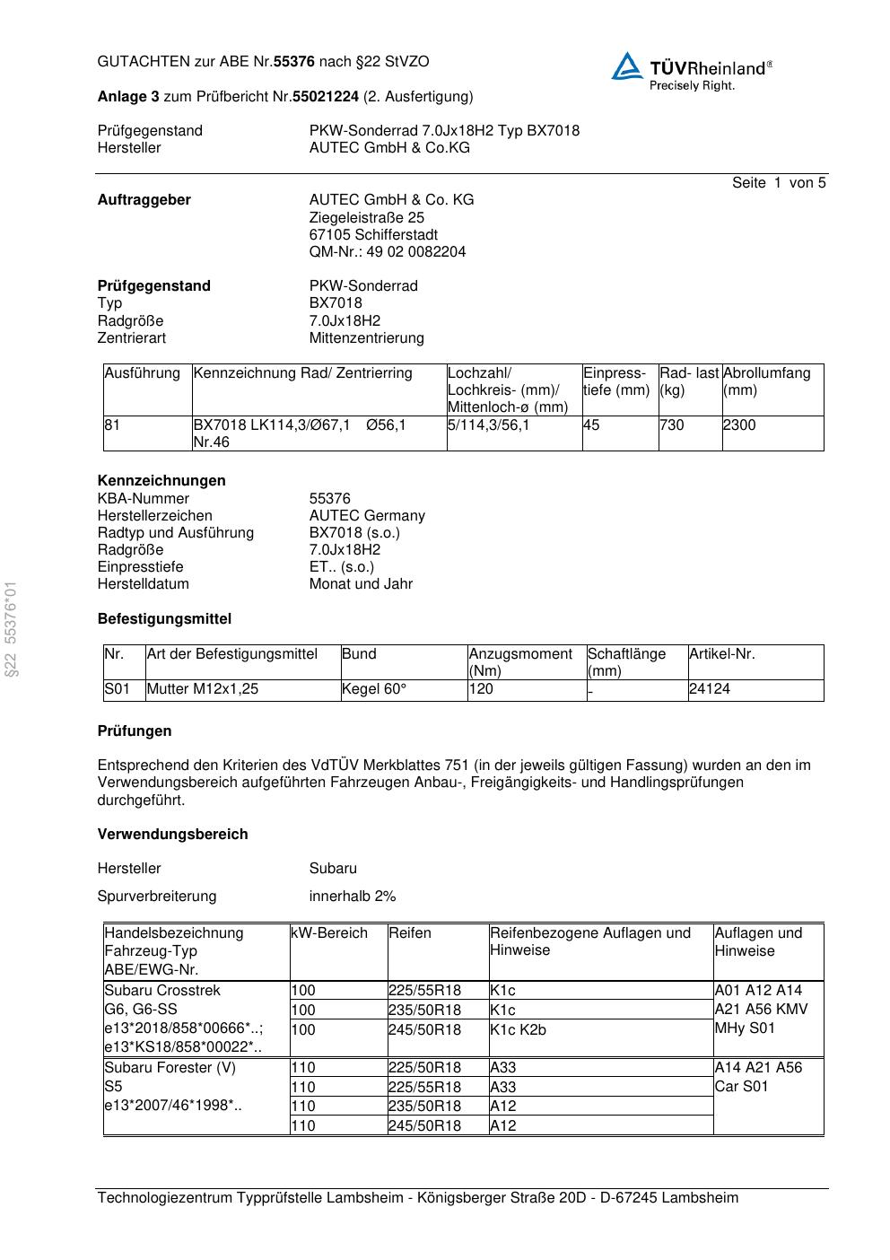 Dieses Gutachten (abe) bezieht sich auf die Alufelge Autec BX7018 in der Ausführung 7Jx18 ET 0, Mittenloch 0 mm (KBA 55376). Im PDF findest du typischerweise zulässige Reifengrößen, Auflagen/Anbauhinweise und – je nach Dokument – Hinweise zur Eintragung.