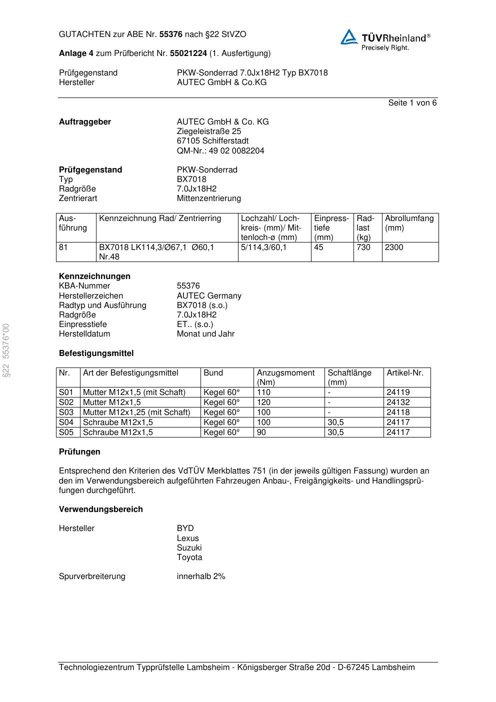 Dieses Gutachten (abe) bezieht sich auf die Alufelge Autec BX7018 in der Ausführung 7Jx18 ET 0, Mittenloch 0 mm (KBA 55376). Im PDF findest du typischerweise zulässige Reifengrößen, Auflagen/Anbauhinweise und – je nach Dokument – Hinweise zur Eintragung.