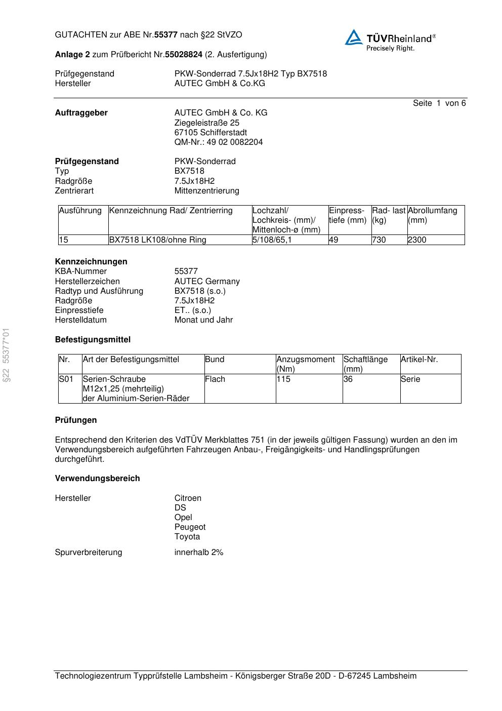 Dieses Gutachten (abe) bezieht sich auf die Alufelge brand-autec BX7518 in der Ausführung 7.5Jx18 ET 0, Mittenloch 0 mm (KBA 55377). Im PDF findest du typischerweise zulässige Reifengrößen, Auflagen/Anbauhinweise und – je nach Dokument – Hinweise zur Eintragung.
