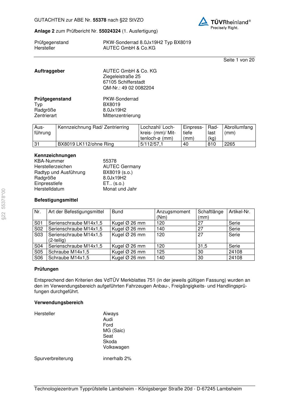 Dieses Gutachten (abe) bezieht sich auf die Alufelge Autec BX8019 in der Ausführung 8Jx19 ET 0, Mittenloch 0 mm (KBA 55378). Im PDF findest du typischerweise zulässige Reifengrößen, Auflagen/Anbauhinweise und – je nach Dokument – Hinweise zur Eintragung.