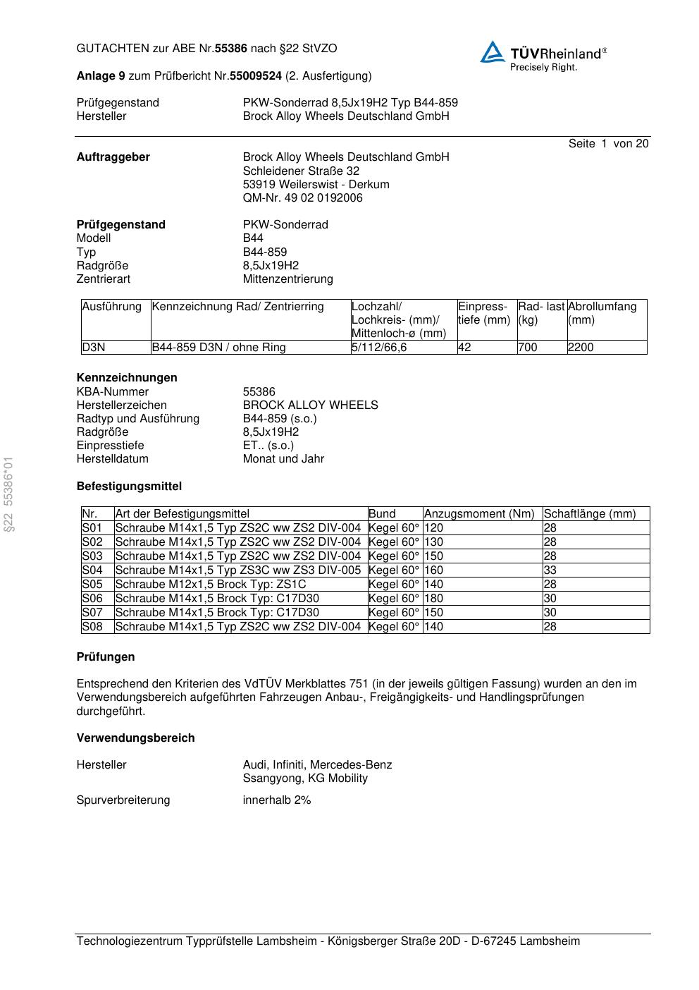 Felgengutachten / abe für Alufelgen Brock B44-859 (8.5Jx19 ET 0, Mittenloch 0 mm) mit KBA 55386 (Zertifikatsnummer 55386). Hier kostenlos als PDF herunterladen. Der Download-Link ist 24 Stunden gültig und kann bis zu zwei Mal verwendet werden.