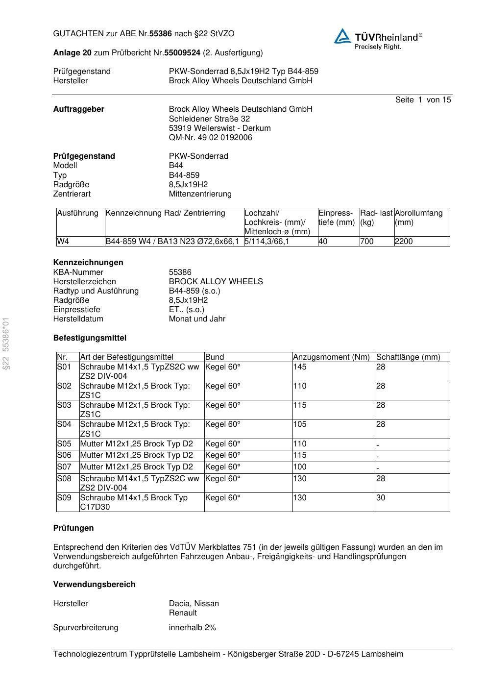 Dieses Gutachten (abe) bezieht sich auf die Alufelge Brock B44-859 in der Ausführung 8.5Jx19 ET 0, Mittenloch 0 mm (KBA 55386). Im PDF findest du typischerweise zulässige Reifengrößen, Auflagen/Anbauhinweise und – je nach Dokument – Hinweise zur Eintragung.