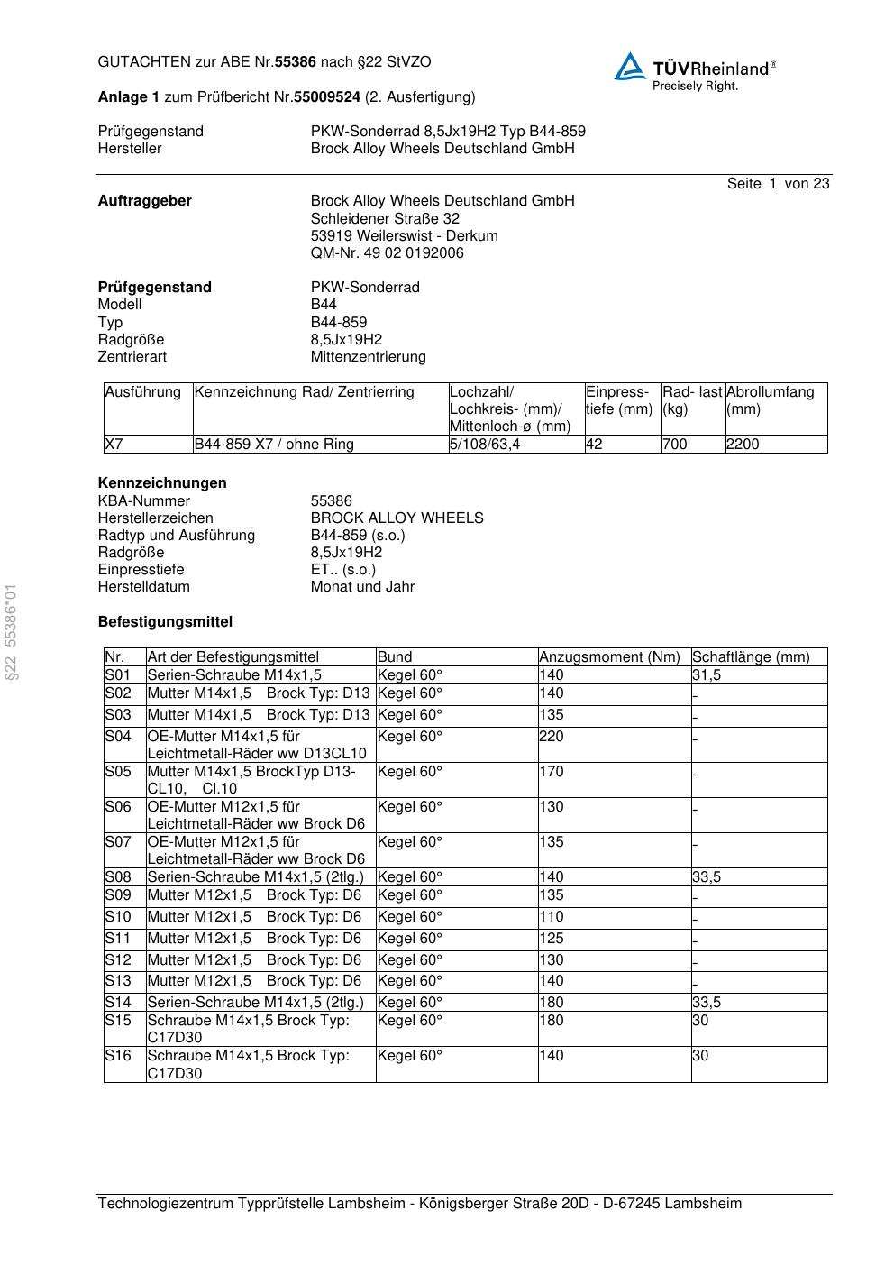 Dieses Gutachten (abe) bezieht sich auf die Alufelge Brock B44-859 in der Ausführung 8.5Jx19 ET 0, Mittenloch 0 mm (KBA 55386). Im PDF findest du typischerweise zulässige Reifengrößen, Auflagen/Anbauhinweise und – je nach Dokument – Hinweise zur Eintragung.