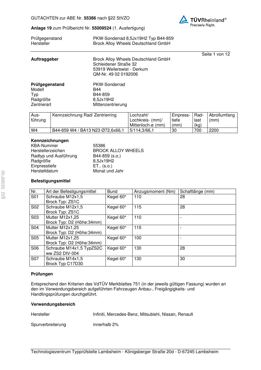 Dieses Gutachten (abe) bezieht sich auf die Alufelge Brock B44-859 in der Ausführung 8.5Jx19 ET 0, Mittenloch 0 mm (KBA 55386). Im PDF findest du typischerweise zulässige Reifengrößen, Auflagen/Anbauhinweise und – je nach Dokument – Hinweise zur Eintragung.