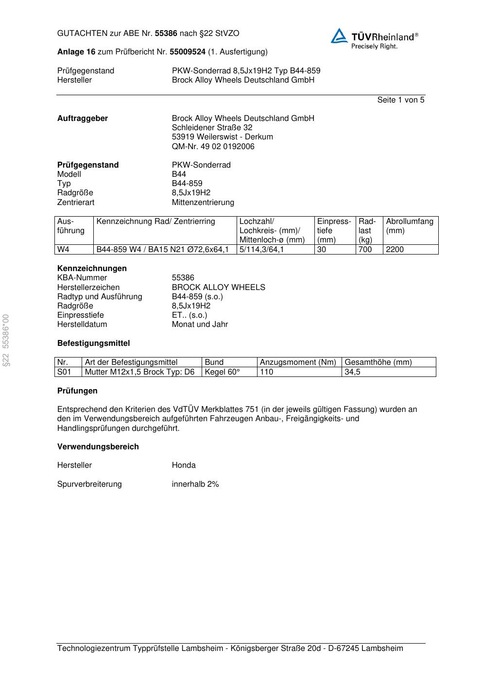 Felgengutachten / abe für Alufelgen Brock B44-859 (8.5Jx19 ET 0, Mittenloch 0 mm) mit KBA 55386 (Zertifikatsnummer 55386). Hier kostenlos als PDF herunterladen. Der Download-Link ist 24 Stunden gültig und kann bis zu zwei Mal verwendet werden.