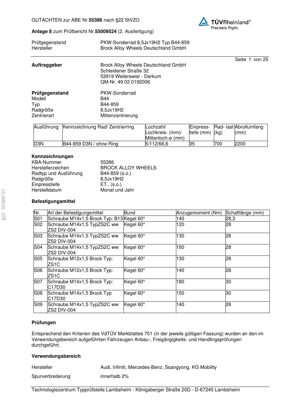 Dieses Gutachten (abe) bezieht sich auf die Alufelge Brock B44-859 in der Ausführung 8.5Jx19 ET 0, Mittenloch 0 mm (KBA 55386). Im PDF findest du typischerweise zulässige Reifengrößen, Auflagen/Anbauhinweise und – je nach Dokument – Hinweise zur Eintragung.