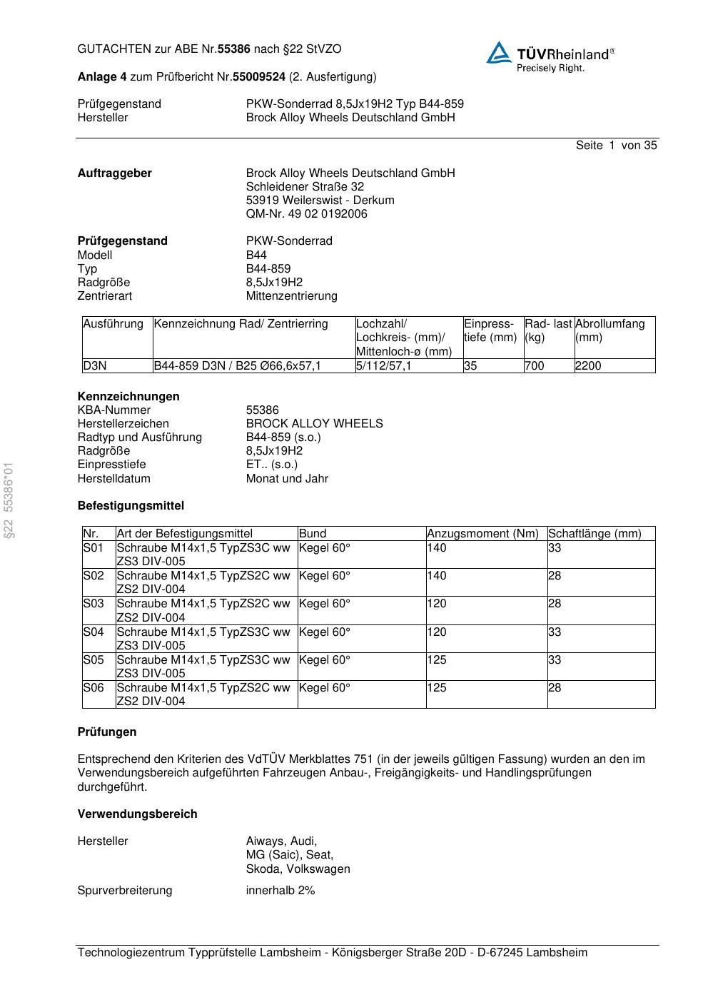 Felgengutachten / abe für Alufelgen Brock B44-859 (8.5Jx19 ET 0, Mittenloch 0 mm) mit KBA 55386 (Zertifikatsnummer 55386). Hier kostenlos als PDF herunterladen. Der Download-Link ist 24 Stunden gültig und kann bis zu zwei Mal verwendet werden.