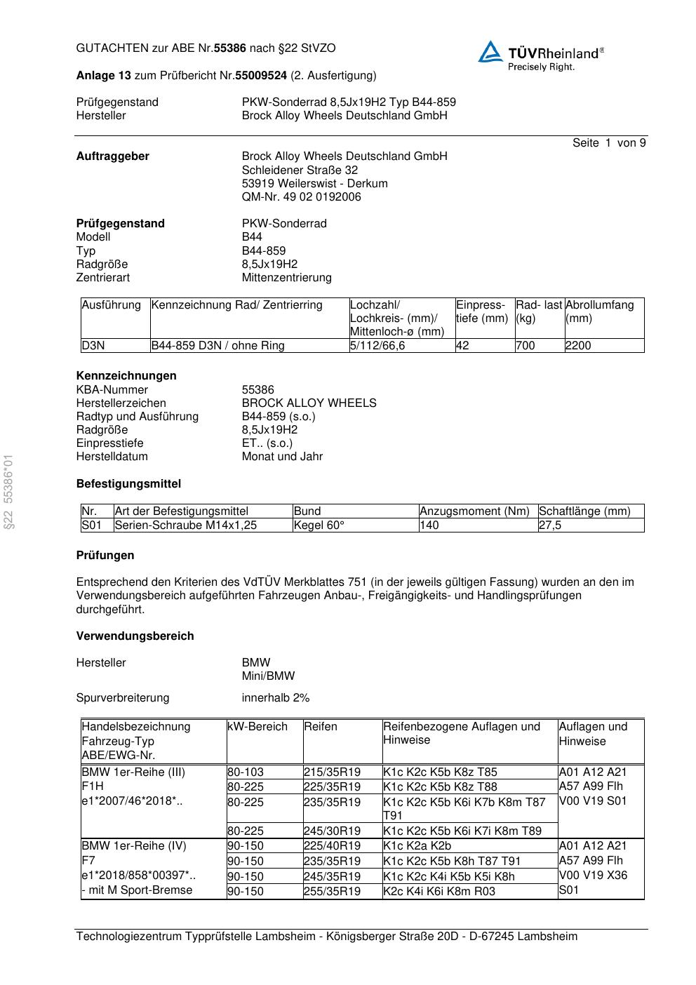 Dieses Gutachten (abe) bezieht sich auf die Alufelge Brock B44-859 in der Ausführung 8.5Jx19 ET 0, Mittenloch 0 mm (KBA 55386). Im PDF findest du typischerweise zulässige Reifengrößen, Auflagen/Anbauhinweise und – je nach Dokument – Hinweise zur Eintragung.