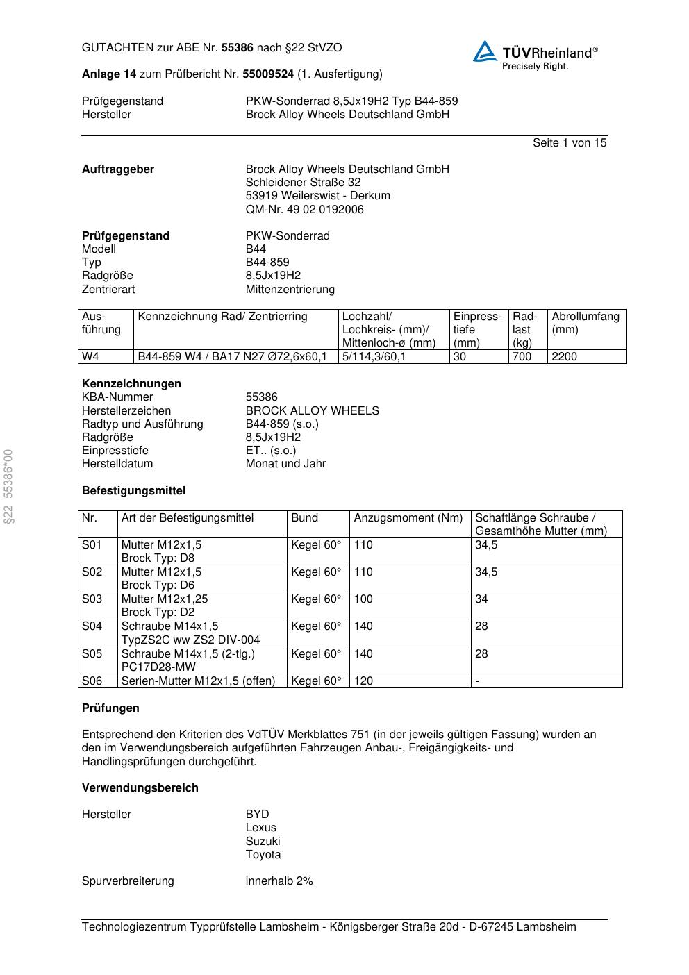 Dieses Gutachten (abe) bezieht sich auf die Alufelge Brock B44-859 in der Ausführung 8.5Jx19 ET 0, Mittenloch 0 mm (KBA 55386). Im PDF findest du typischerweise zulässige Reifengrößen, Auflagen/Anbauhinweise und – je nach Dokument – Hinweise zur Eintragung.