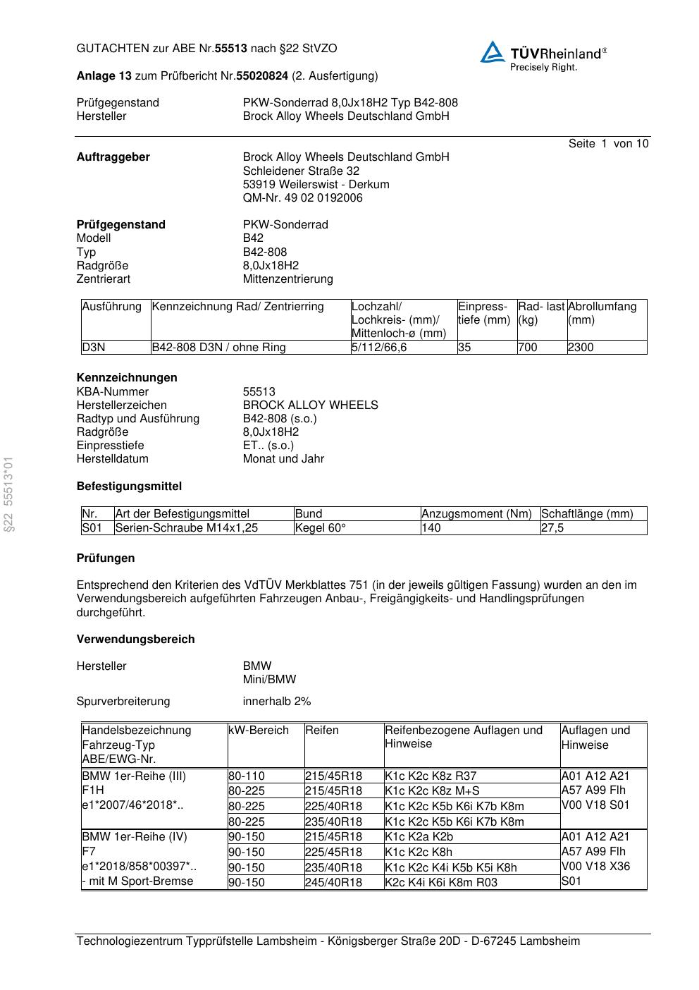 Dieses Gutachten (abe) bezieht sich auf die Alufelge Brock B42-808 in der Ausführung 8Jx18 ET 0, Mittenloch 0 mm (KBA 55513). Im PDF findest du typischerweise zulässige Reifengrößen, Auflagen/Anbauhinweise und – je nach Dokument – Hinweise zur Eintragung.