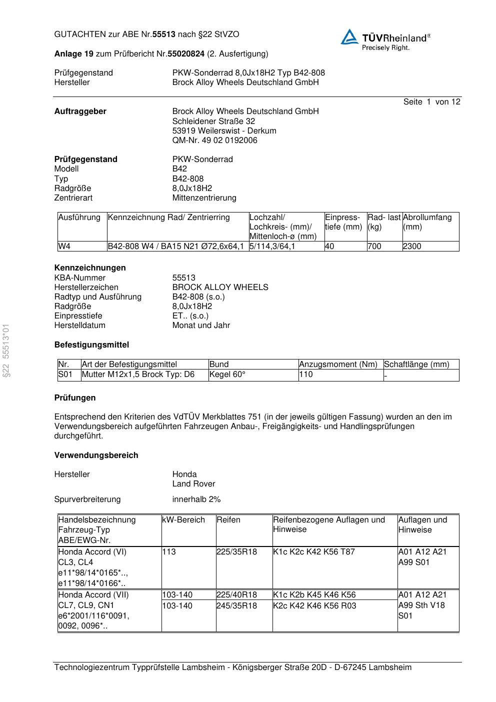Dieses Gutachten (abe) bezieht sich auf die Alufelge Brock B42-808 in der Ausführung 8Jx18 ET 0, Mittenloch 0 mm (KBA 55513). Im PDF findest du typischerweise zulässige Reifengrößen, Auflagen/Anbauhinweise und – je nach Dokument – Hinweise zur Eintragung.