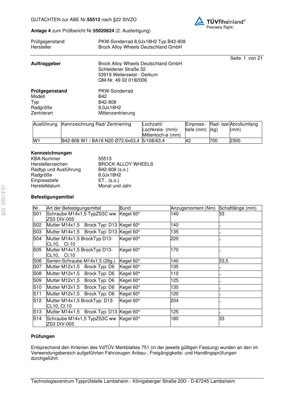 Felgengutachten / abe für Alufelgen Brock B42-808 (8Jx18 ET 0, Mittenloch 0 mm) mit KBA 55513 (Zertifikatsnummer 55513). Hier kostenlos als PDF herunterladen. Der Download-Link ist 24 Stunden gültig und kann bis zu zwei Mal verwendet werden.