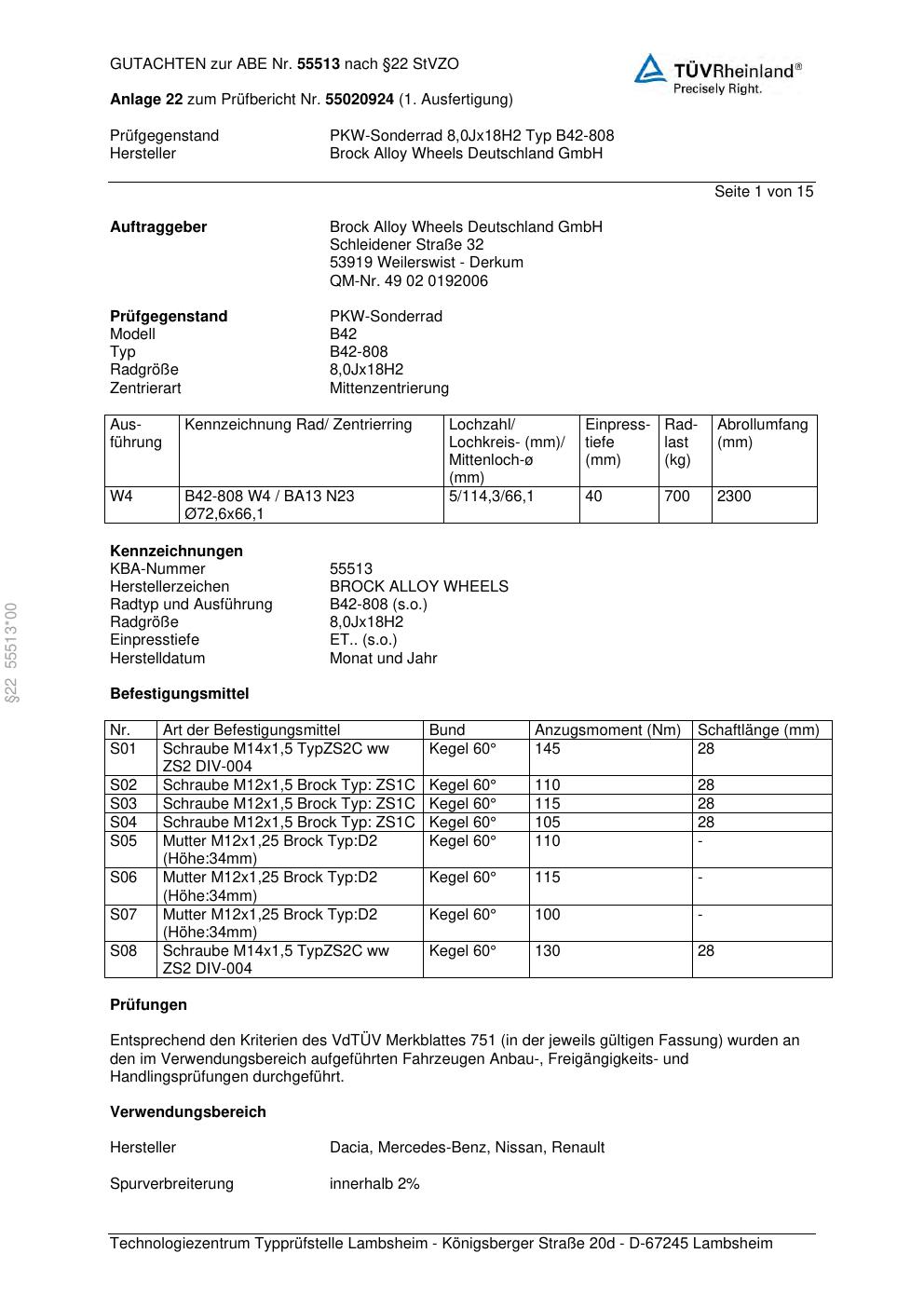 Dieses Gutachten (abe) bezieht sich auf die Alufelge Brock B42-808 in der Ausführung 8Jx18 ET 0, Mittenloch 0 mm (KBA 55513). Im PDF findest du typischerweise zulässige Reifengrößen, Auflagen/Anbauhinweise und – je nach Dokument – Hinweise zur Eintragung.