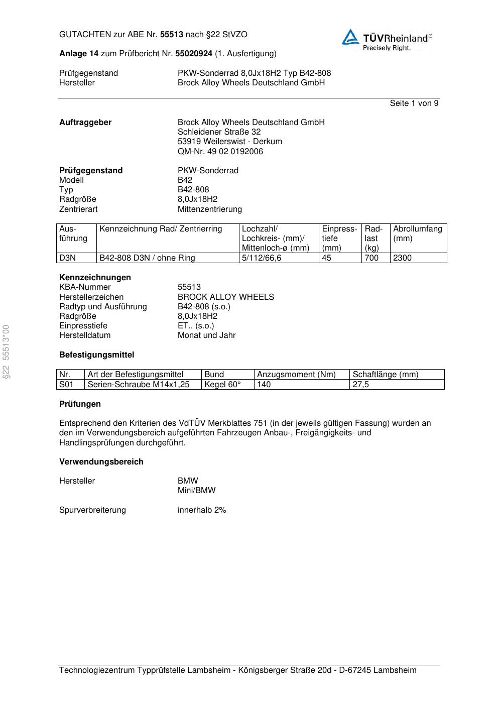 Dieses Gutachten (abe) bezieht sich auf die Alufelge Brock B42-808 in der Ausführung 8Jx18 ET 0, Mittenloch 0 mm (KBA 55513). Im PDF findest du typischerweise zulässige Reifengrößen, Auflagen/Anbauhinweise und – je nach Dokument – Hinweise zur Eintragung.