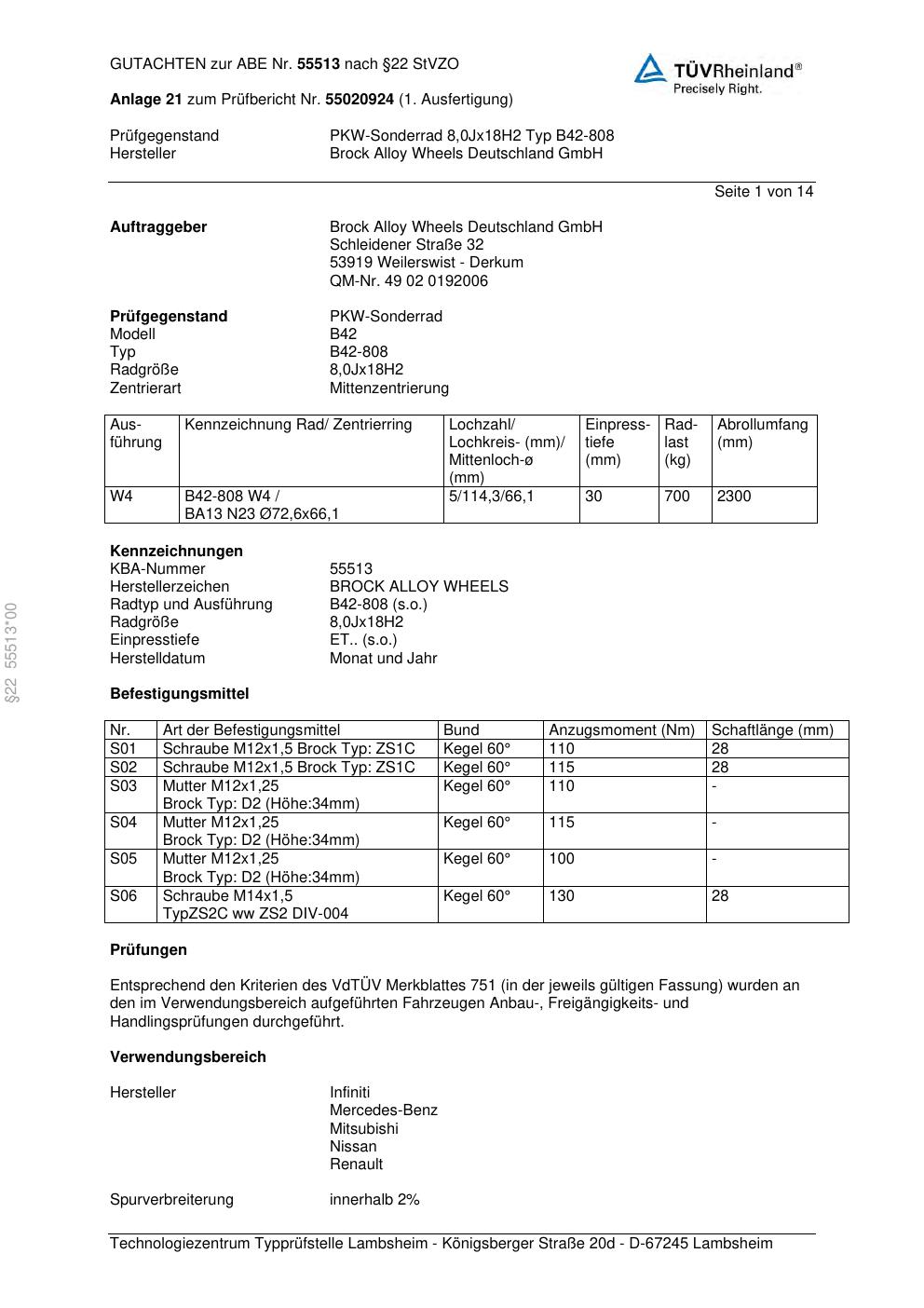 Felgengutachten / abe für Alufelgen Brock B42-808 (8Jx18 ET 0, Mittenloch 0 mm) mit KBA 55513 (Zertifikatsnummer 55513). Hier kostenlos als PDF herunterladen. Der Download-Link ist 24 Stunden gültig und kann bis zu zwei Mal verwendet werden.