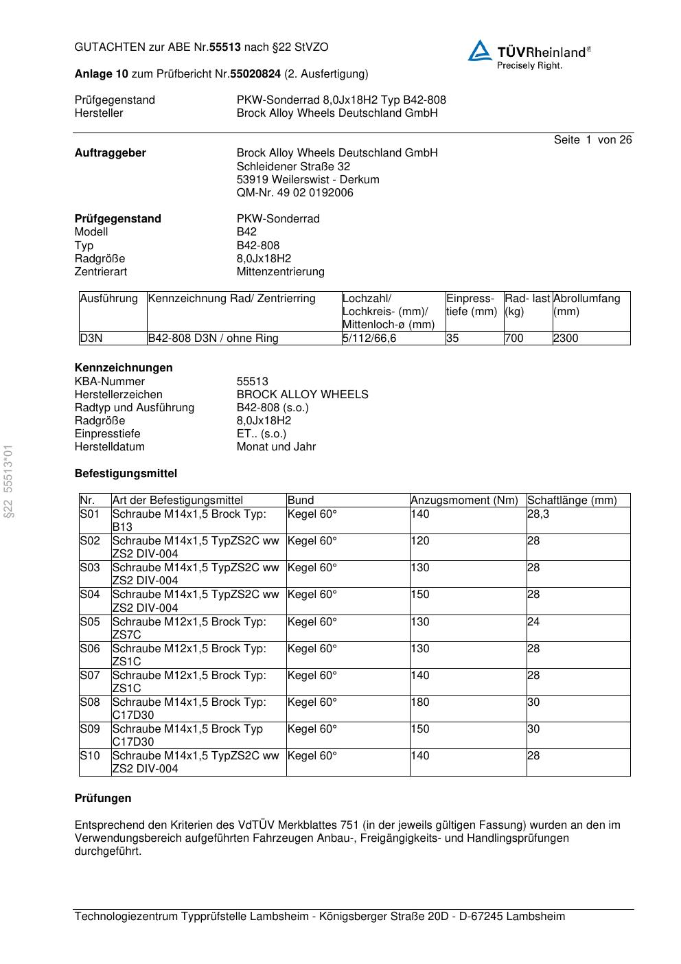 Dieses Gutachten (abe) bezieht sich auf die Alufelge Brock B42-808 in der Ausführung 8Jx18 ET 0, Mittenloch 0 mm (KBA 55513). Im PDF findest du typischerweise zulässige Reifengrößen, Auflagen/Anbauhinweise und – je nach Dokument – Hinweise zur Eintragung.