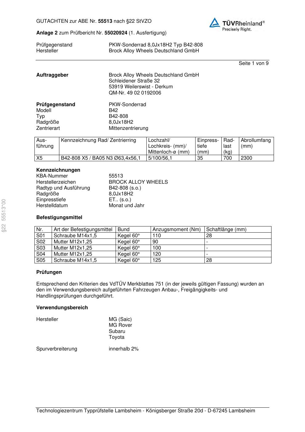 Dieses Gutachten (abe) bezieht sich auf die Alufelge Brock B42-808 in der Ausführung 8Jx18 ET 0, Mittenloch 0 mm (KBA 55513). Im PDF findest du typischerweise zulässige Reifengrößen, Auflagen/Anbauhinweise und – je nach Dokument – Hinweise zur Eintragung.