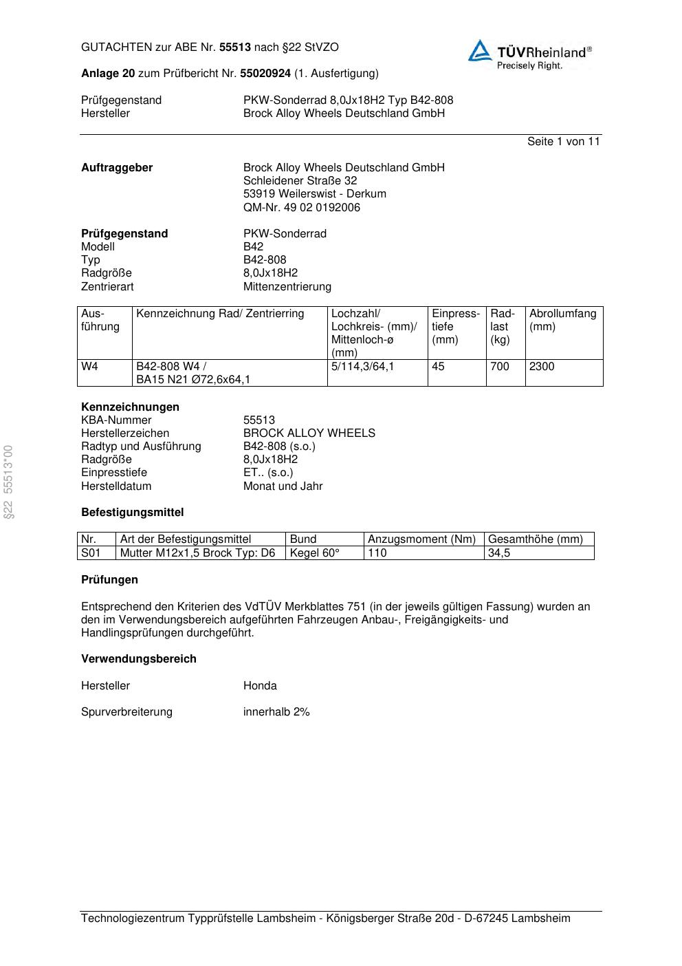 Dieses Gutachten (abe) bezieht sich auf die Alufelge Brock B42-808 in der Ausführung 8Jx18 ET 0, Mittenloch 0 mm (KBA 55513). Im PDF findest du typischerweise zulässige Reifengrößen, Auflagen/Anbauhinweise und – je nach Dokument – Hinweise zur Eintragung.