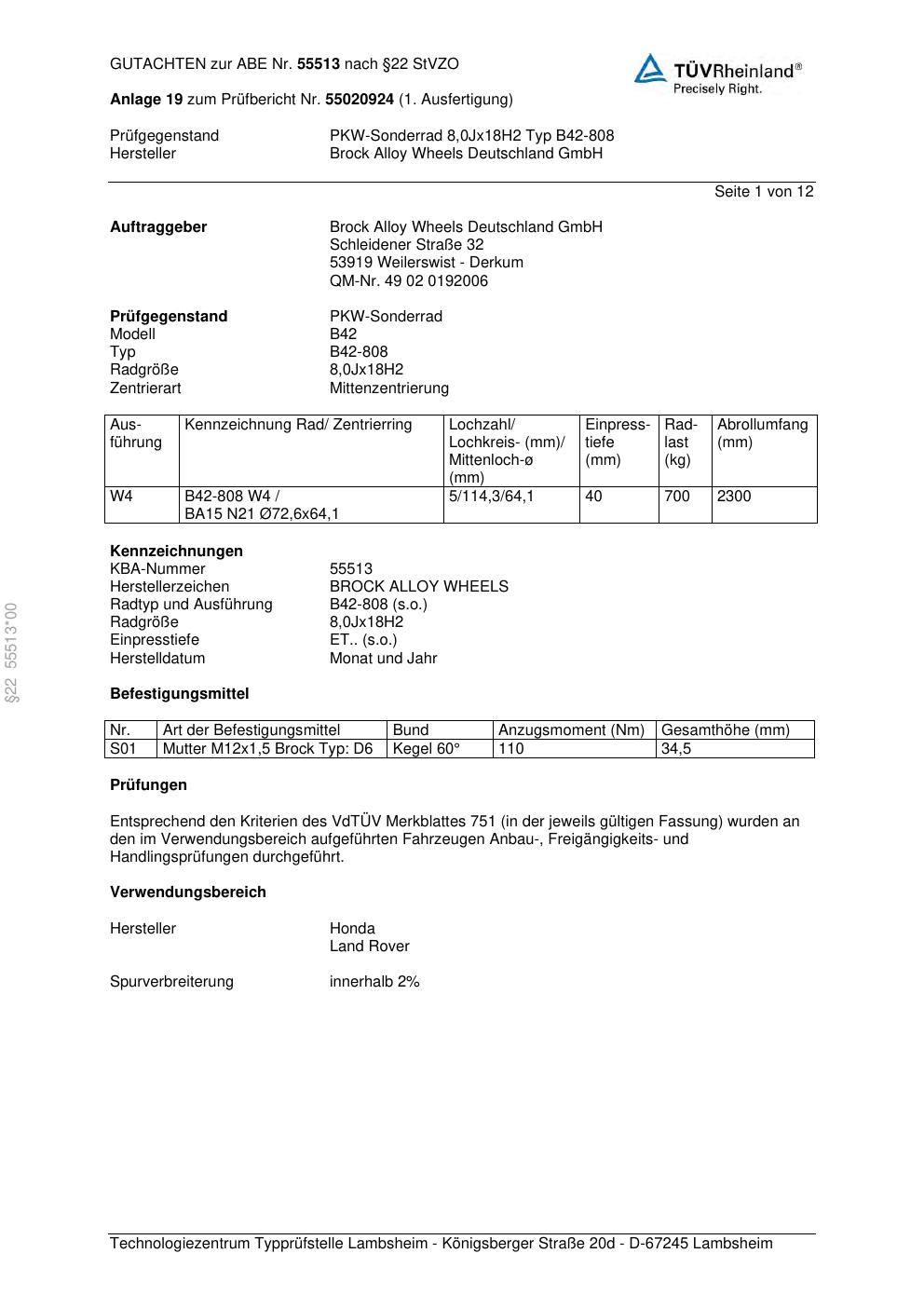 Dieses Gutachten (abe) bezieht sich auf die Alufelge Brock B42-808 in der Ausführung 8Jx18 ET 0, Mittenloch 0 mm (KBA 55513). Im PDF findest du typischerweise zulässige Reifengrößen, Auflagen/Anbauhinweise und – je nach Dokument – Hinweise zur Eintragung.