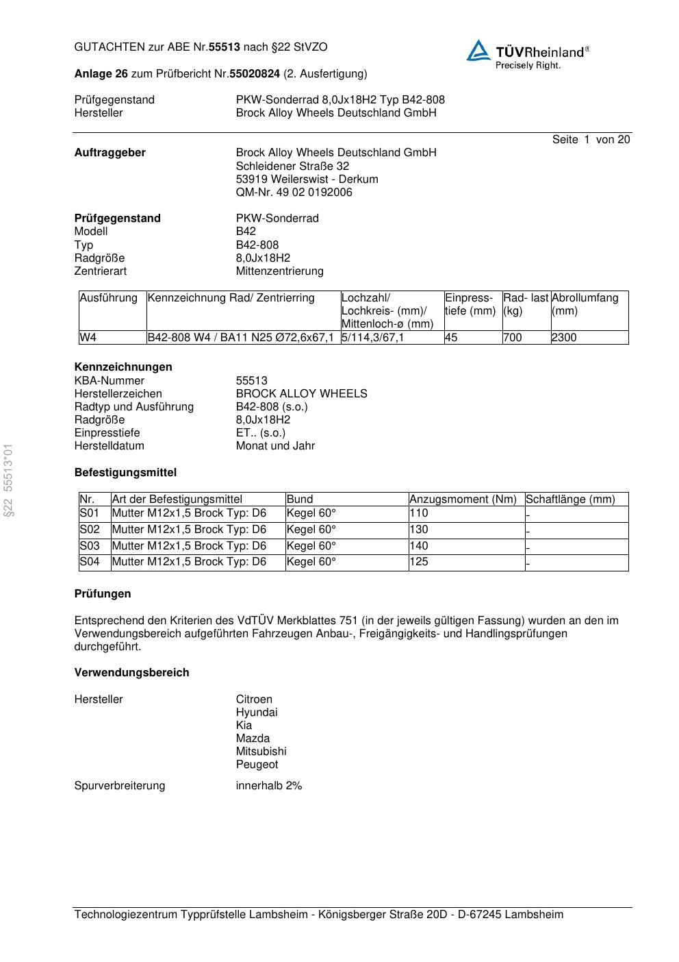 Felgengutachten / abe für Alufelgen Brock B42-808 (8Jx18 ET 0, Mittenloch 0 mm) mit KBA 55513 (Zertifikatsnummer 55513). Hier kostenlos als PDF herunterladen. Der Download-Link ist 24 Stunden gültig und kann bis zu zwei Mal verwendet werden.
