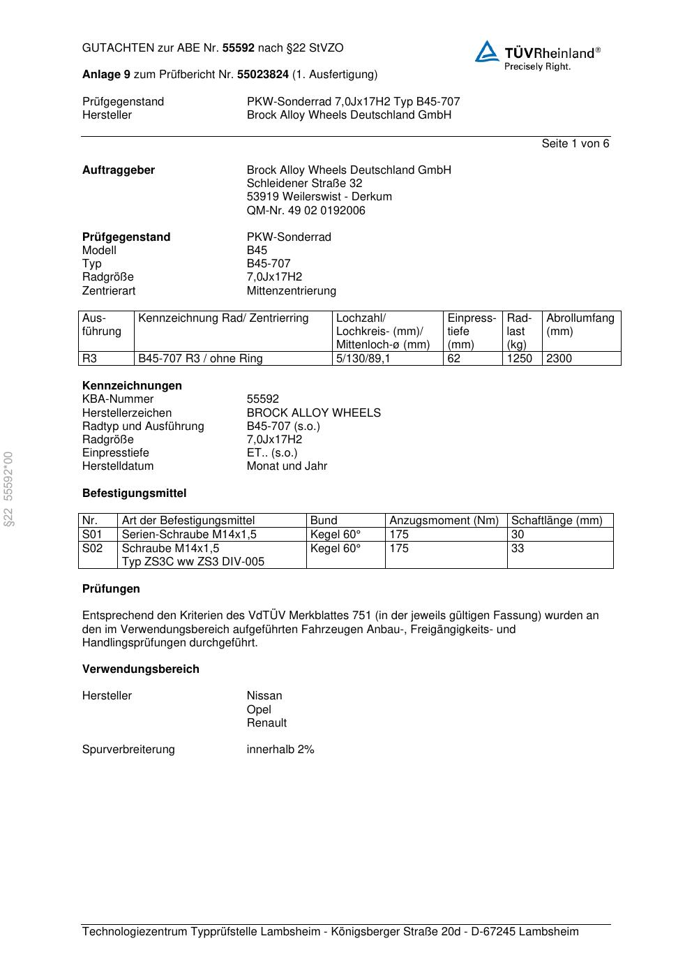 Dieses Gutachten (abe) bezieht sich auf die Alufelge Brock B45-707 in der Ausführung 7Jx17 ET 0, Mittenloch 0 mm (KBA 55592). Im PDF findest du typischerweise zulässige Reifengrößen, Auflagen/Anbauhinweise und – je nach Dokument – Hinweise zur Eintragung.