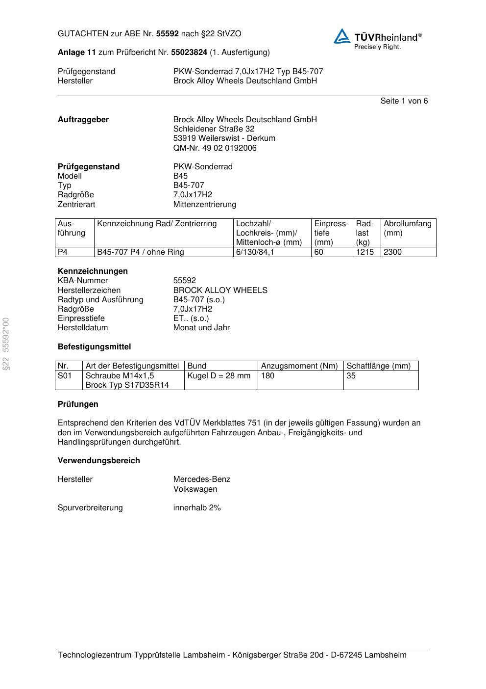 Dieses Gutachten (abe) bezieht sich auf die Alufelge Brock B45-707 in der Ausführung 7Jx17 ET 0, Mittenloch 0 mm (KBA 55592). Im PDF findest du typischerweise zulässige Reifengrößen, Auflagen/Anbauhinweise und – je nach Dokument – Hinweise zur Eintragung.