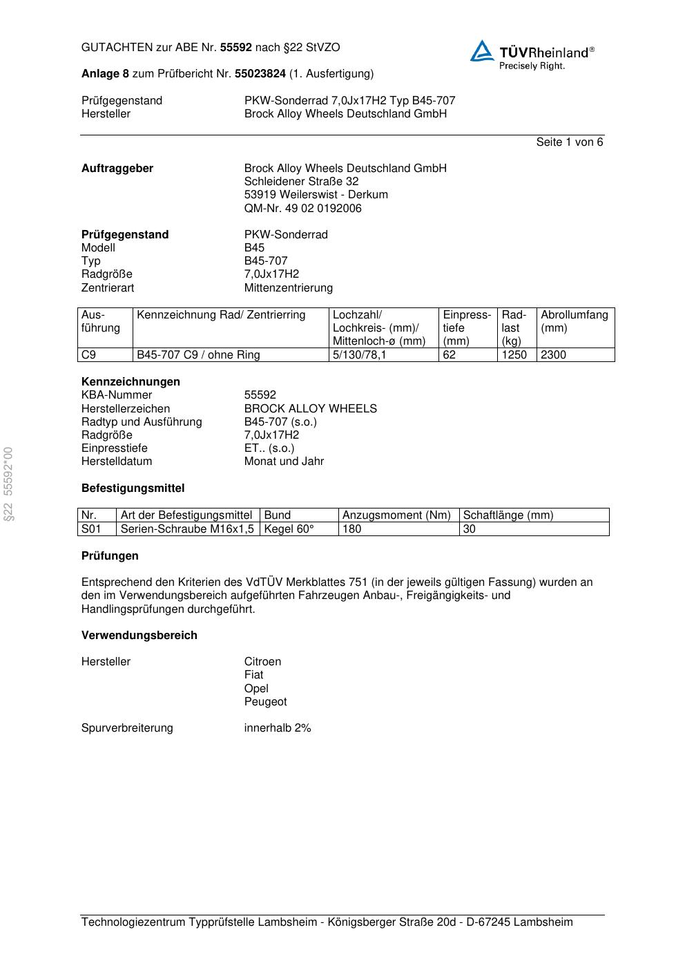 Dieses Gutachten (abe) bezieht sich auf die Alufelge Brock B45-707 in der Ausführung 7Jx17 ET 0, Mittenloch 0 mm (KBA 55592). Im PDF findest du typischerweise zulässige Reifengrößen, Auflagen/Anbauhinweise und – je nach Dokument – Hinweise zur Eintragung.