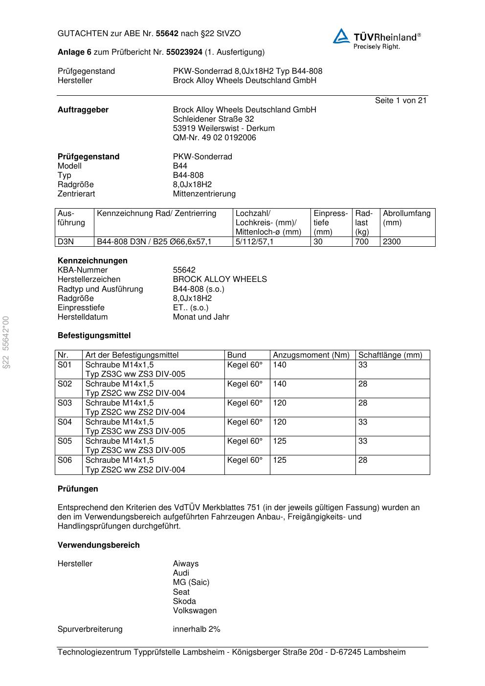 Dieses Gutachten (abe) bezieht sich auf die Alufelge Brock B44-808 in der Ausführung 8Jx18 ET 0, Mittenloch 0 mm (KBA 55642). Im PDF findest du typischerweise zulässige Reifengrößen, Auflagen/Anbauhinweise und – je nach Dokument – Hinweise zur Eintragung.