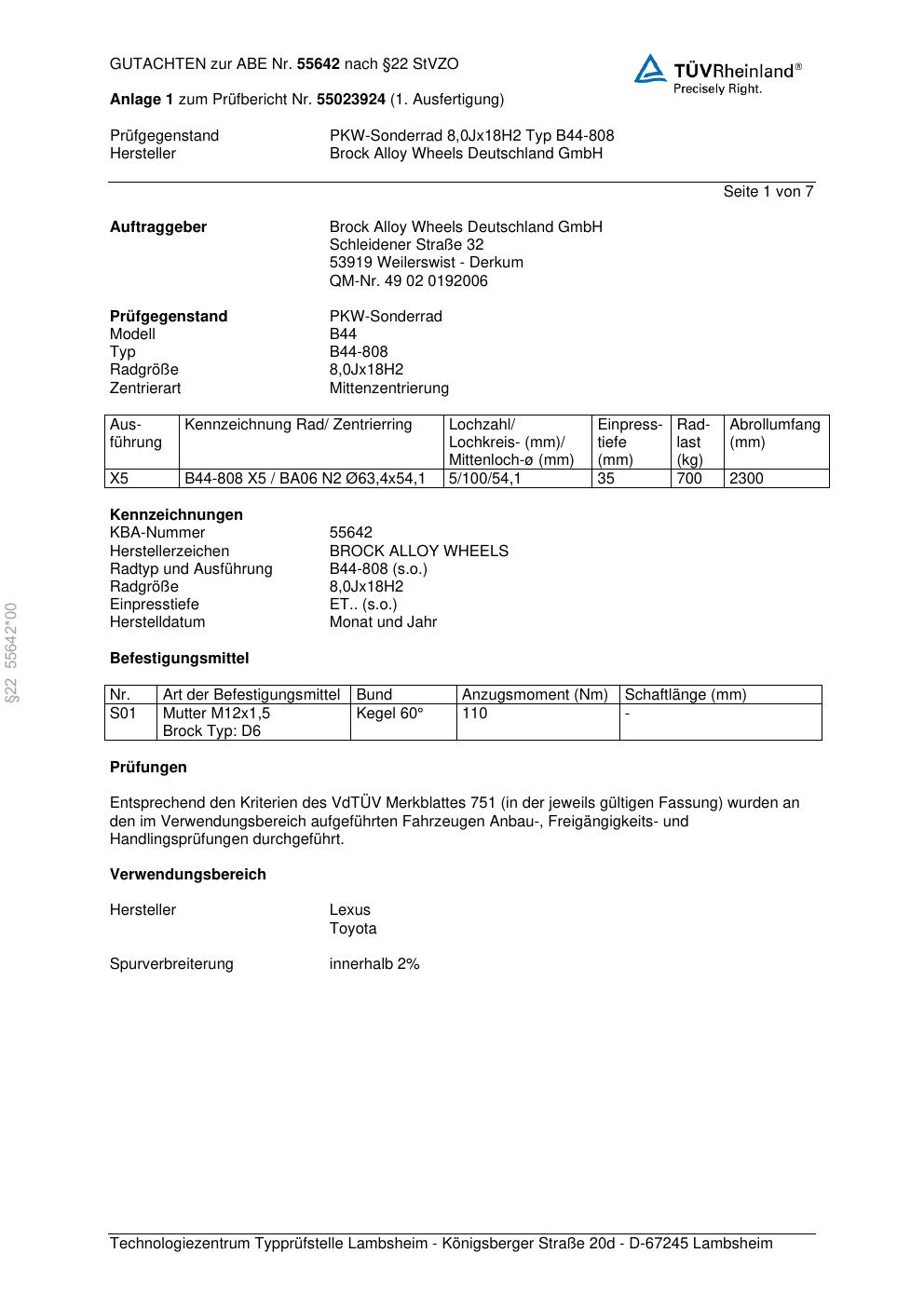 Dieses Gutachten (abe) bezieht sich auf die Alufelge Brock B44-808 in der Ausführung 8Jx18 ET 0, Mittenloch 0 mm (KBA 55642). Im PDF findest du typischerweise zulässige Reifengrößen, Auflagen/Anbauhinweise und – je nach Dokument – Hinweise zur Eintragung.