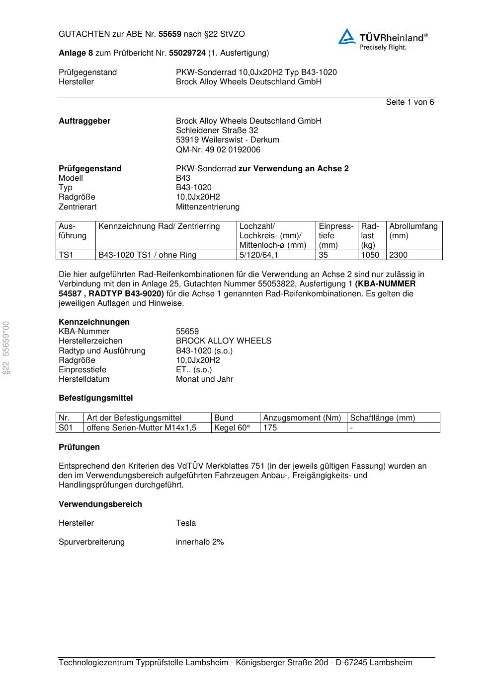 Dieses Gutachten (abe) bezieht sich auf die Alufelge Brock B43-1020 in der Ausführung 10Jx2 ET 0, Mittenloch 0 mm (KBA 55659). Im PDF findest du typischerweise zulässige Reifengrößen, Auflagen/Anbauhinweise und – je nach Dokument – Hinweise zur Eintragung.