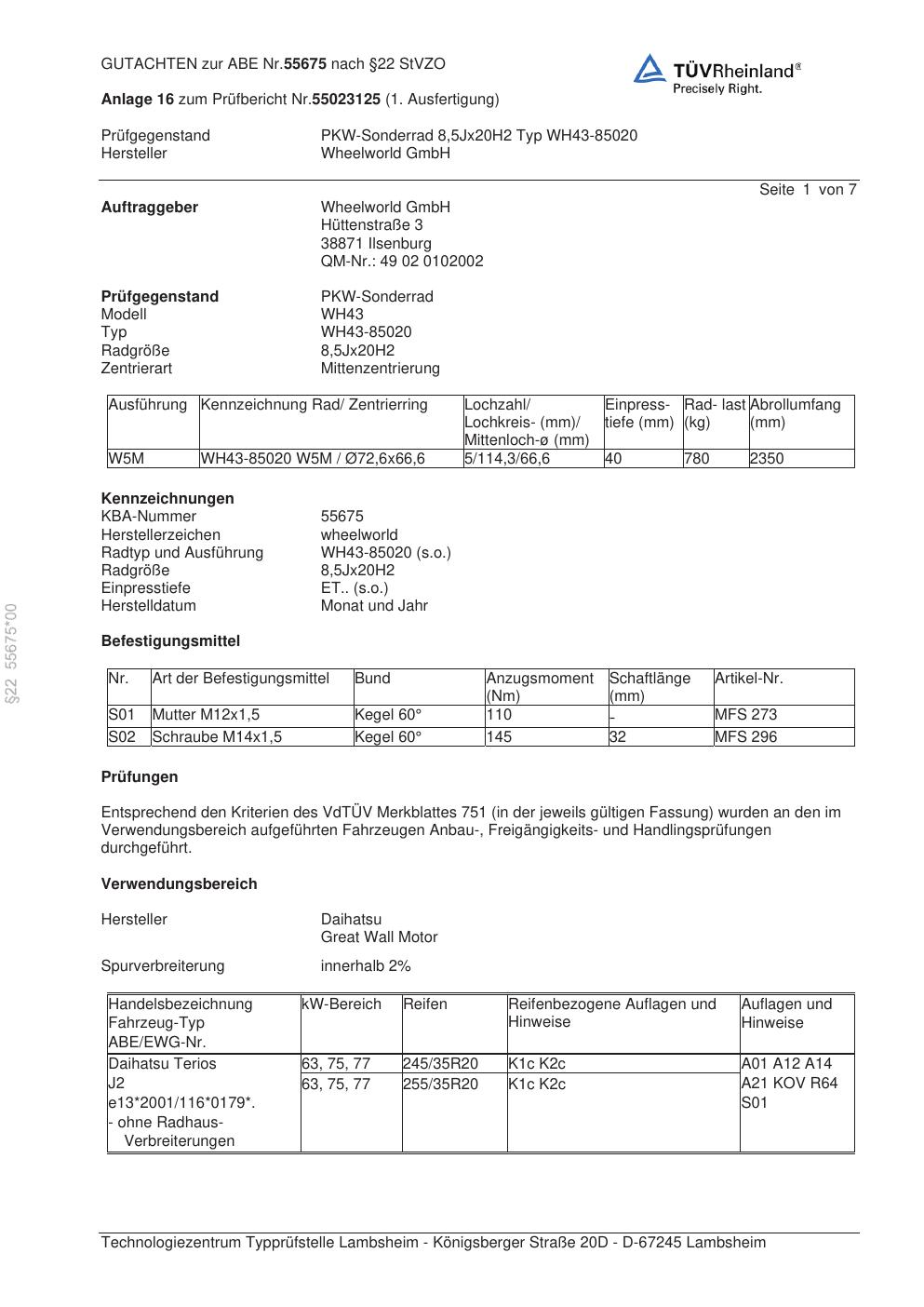 Dieses Gutachten (abe) bezieht sich auf die Alufelge ATS WH43-85020 in der Ausführung 8.5Jx2 ET 0, Mittenloch 0 mm (KBA 55675). Im PDF findest du typischerweise zulässige Reifengrößen, Auflagen/Anbauhinweise und – je nach Dokument – Hinweise zur Eintragung.