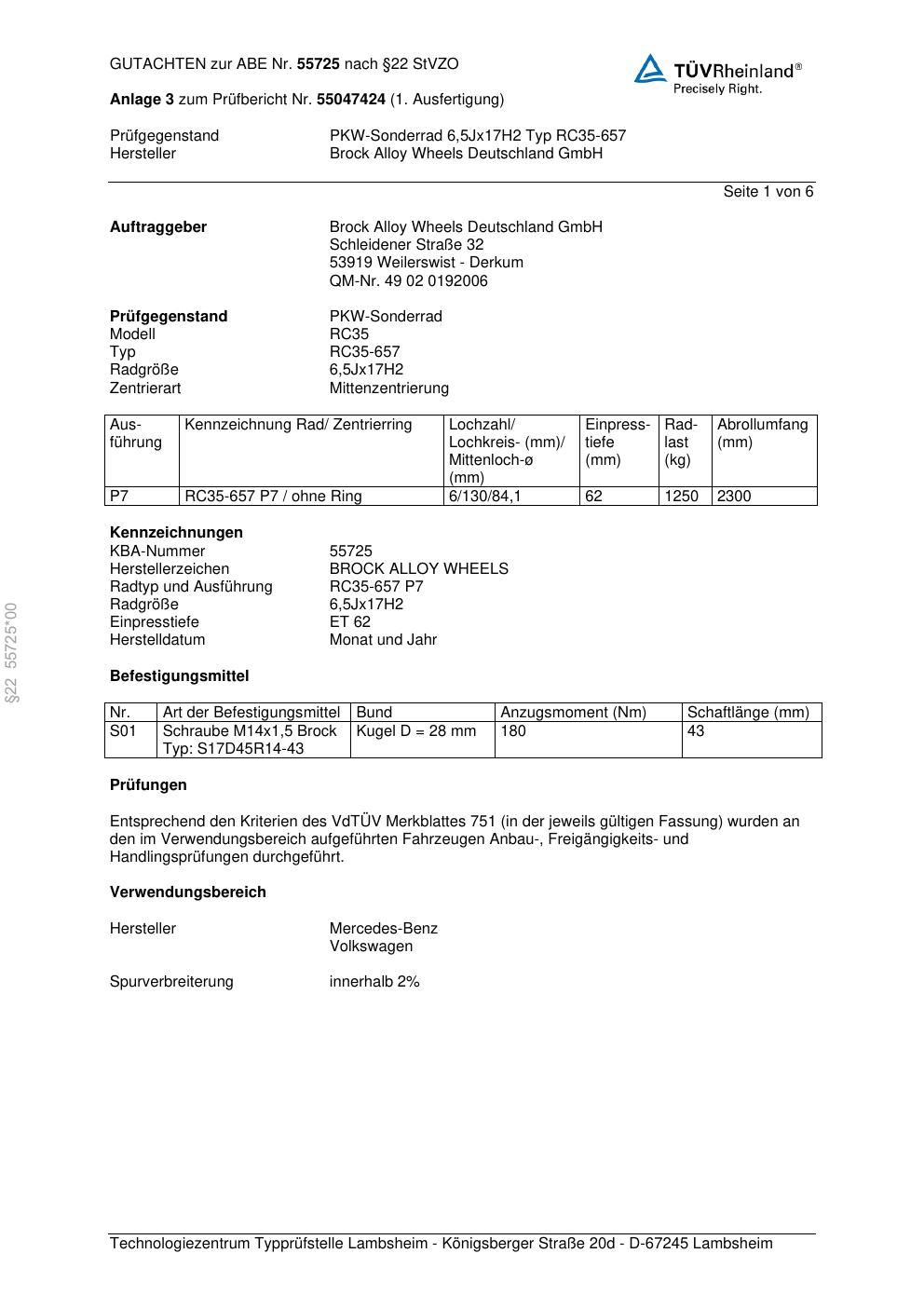 Dieses Gutachten (abe) bezieht sich auf die Alufelge Brock RC35-657 in der Ausführung 6.5Jx17 ET 0, Mittenloch 0 mm (KBA 55725). Im PDF findest du typischerweise zulässige Reifengrößen, Auflagen/Anbauhinweise und – je nach Dokument – Hinweise zur Eintragung.