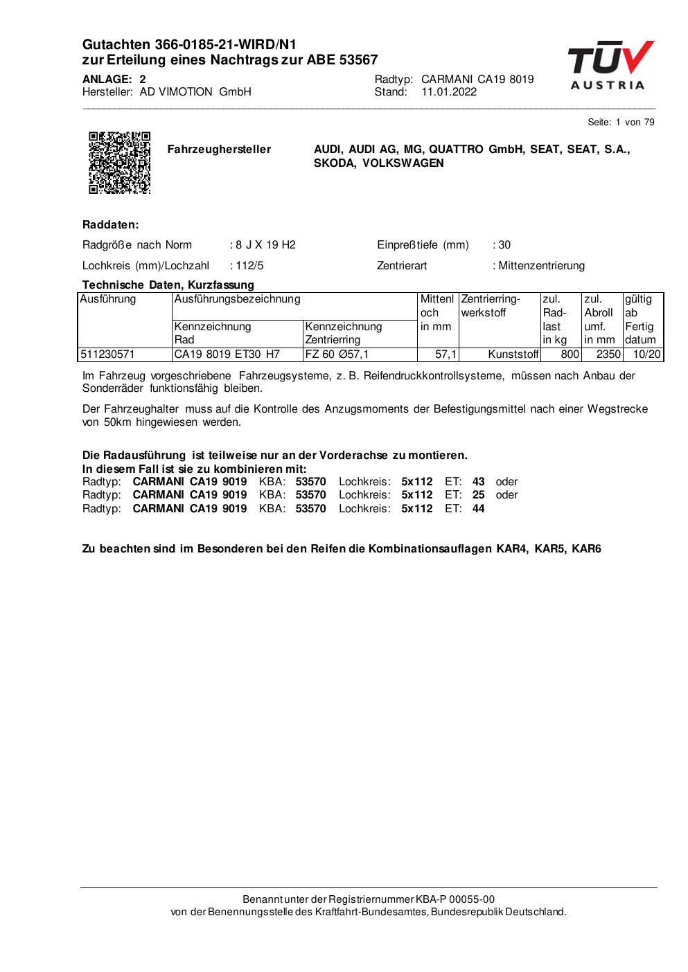 Dieses Gutachten (abe) bezieht sich auf die Alufelge AD VIMOTION CARMANI CA19 8019 in der Ausführung ET 0, Mittenloch 0 mm (KBA 53567). Im PDF findest du typischerweise zulässige Reifengrößen, Auflagen/Anbauhinweise und – je nach Dokument – Hinweise zur Eintragung.