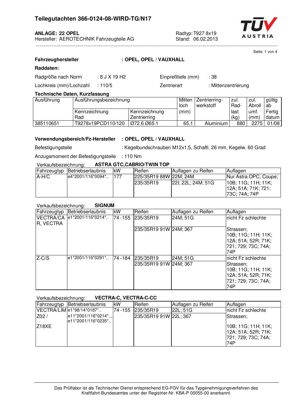 teilegutachten 366-0124-08 AEROTECHNIK T927 8x19