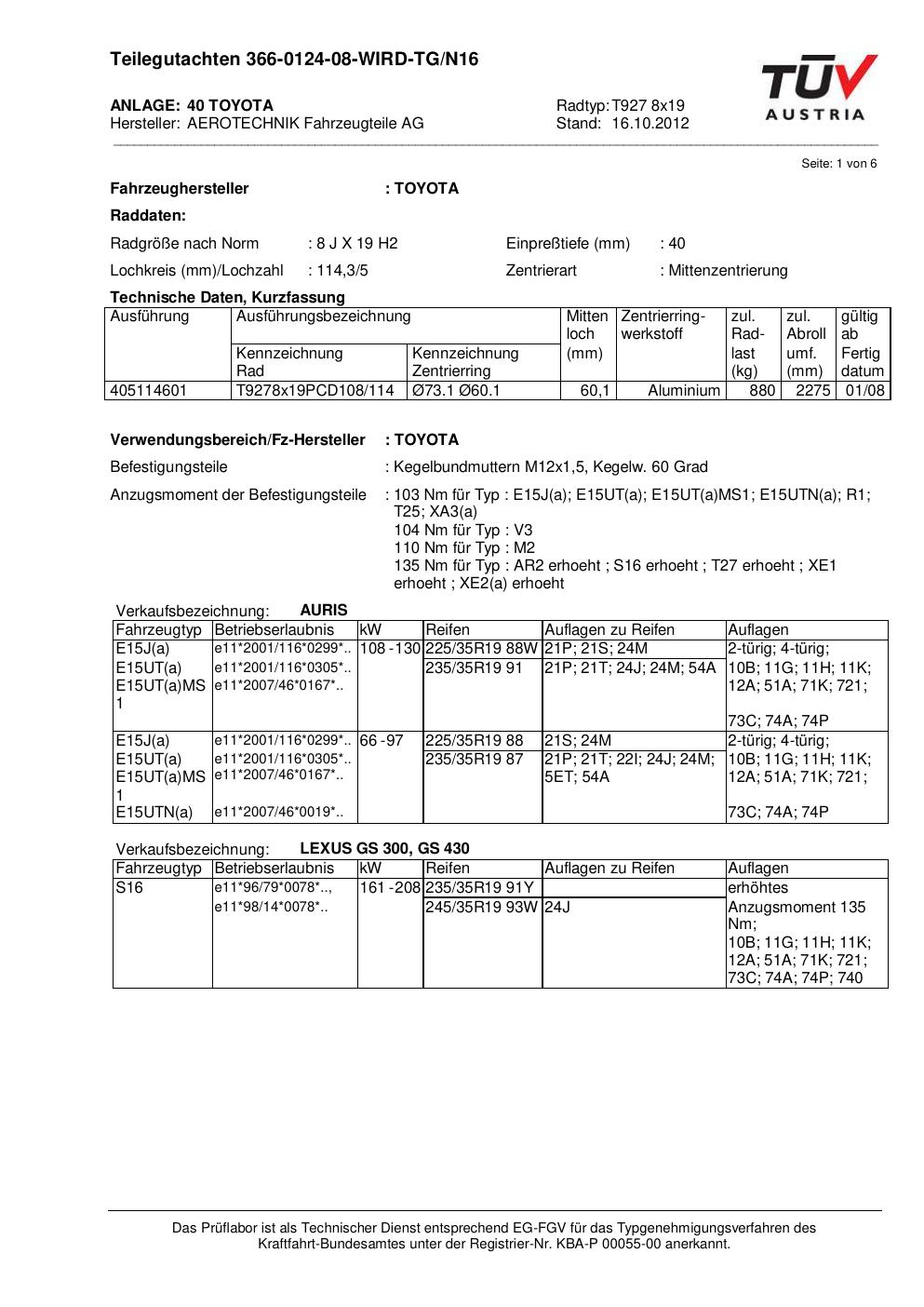 teilegutachten 366-0124-08 AEROTECHNIK T927 8x19