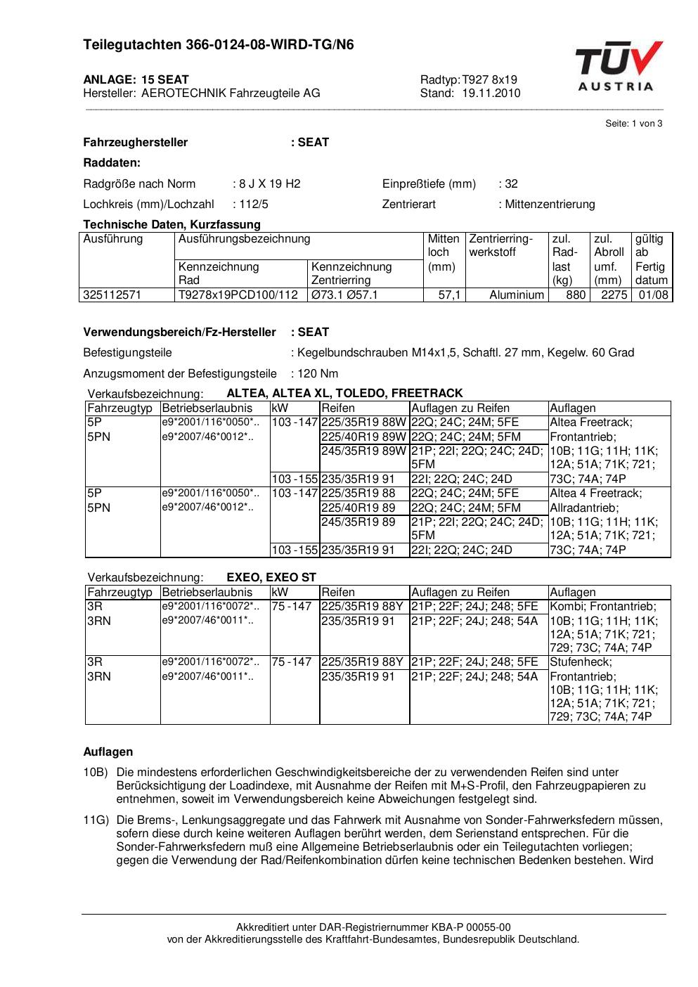 teilegutachten 366-0124-08 AEROTECHNIK T927 8x19