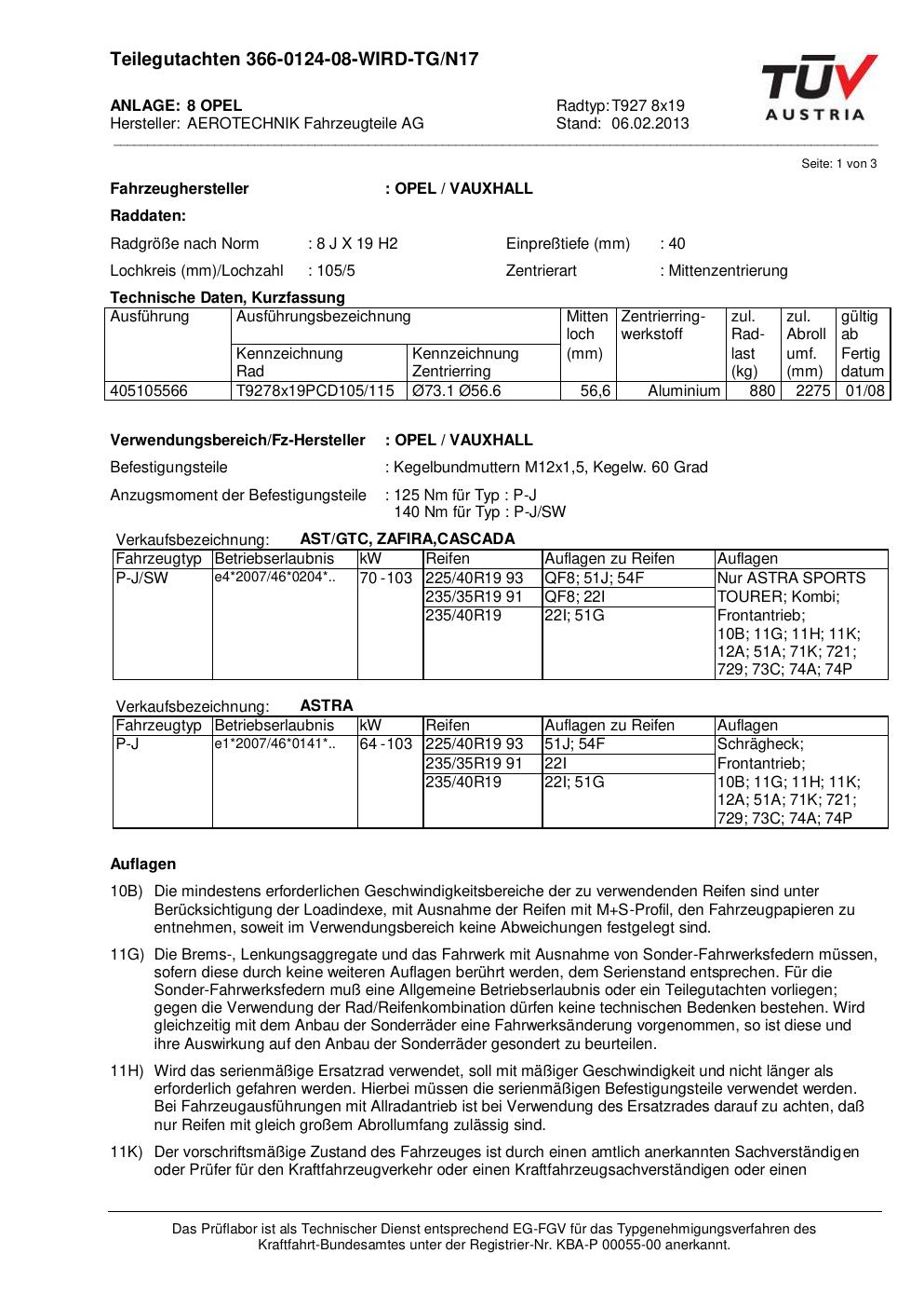 teilegutachten 366-0124-08 AEROTECHNIK T927 8x19
