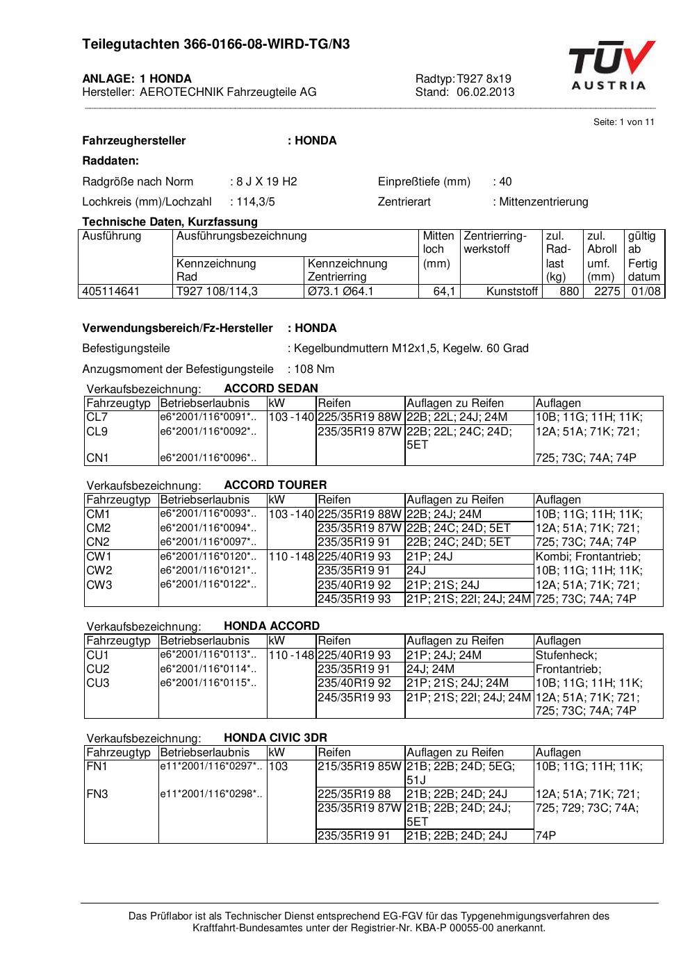 teilegutachten 366-0166-08 AEROTECHNIK T927 8x19