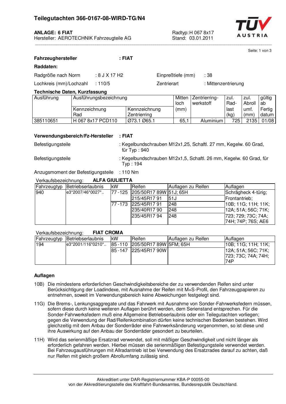 teilegutachten 366-0167-08 AEROTECHNIK H 067 8x17