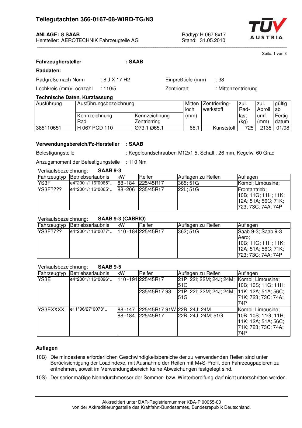 teilegutachten 366-0167-08 AEROTECHNIK H 067 8x17
