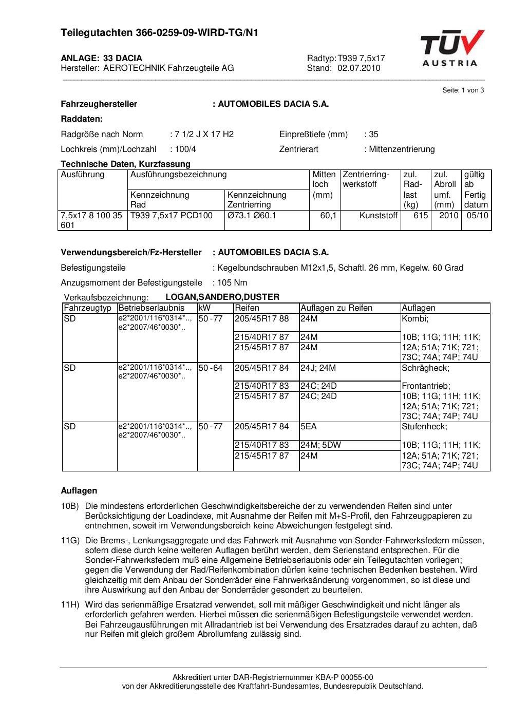 teilegutachten 366-0259-09 AEROTECHNIK T939 7,5x17