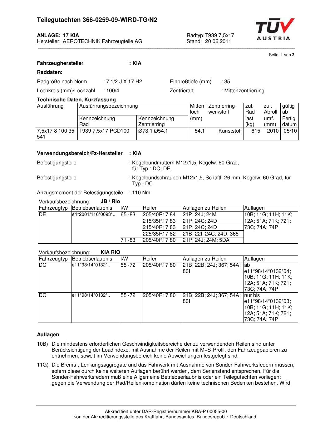 teilegutachten 366-0259-09 AEROTECHNIK T939 7,5x17