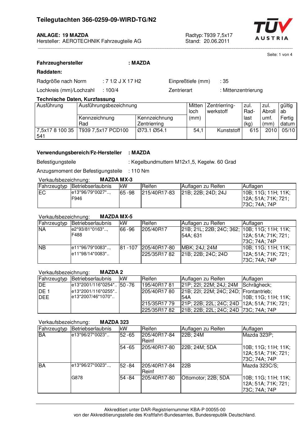 teilegutachten 366-0259-09 AEROTECHNIK T939 7,5x17