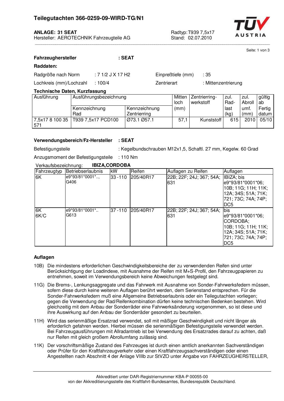 teilegutachten 366-0259-09 AEROTECHNIK T939 7,5x17