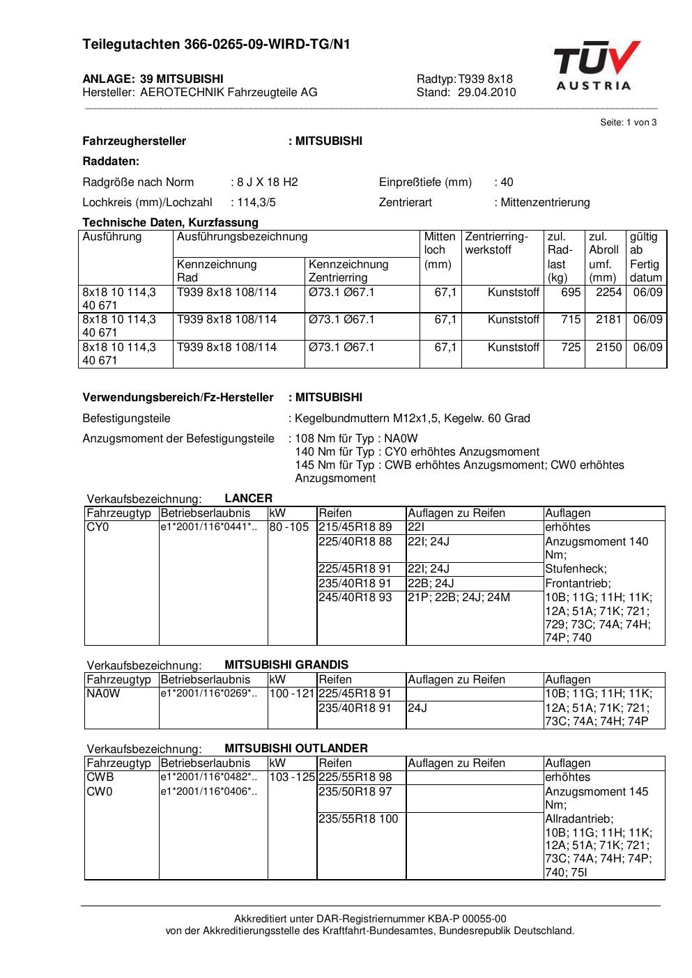 teilegutachten 366-0265-09 AEROTECHNIK T939 8x18
