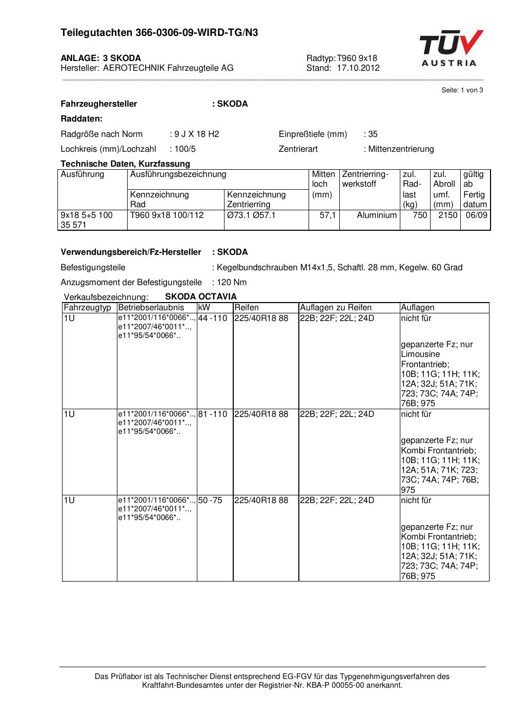 teilegutachten 366-0306-09 AEROTECHNIK T960 9x18