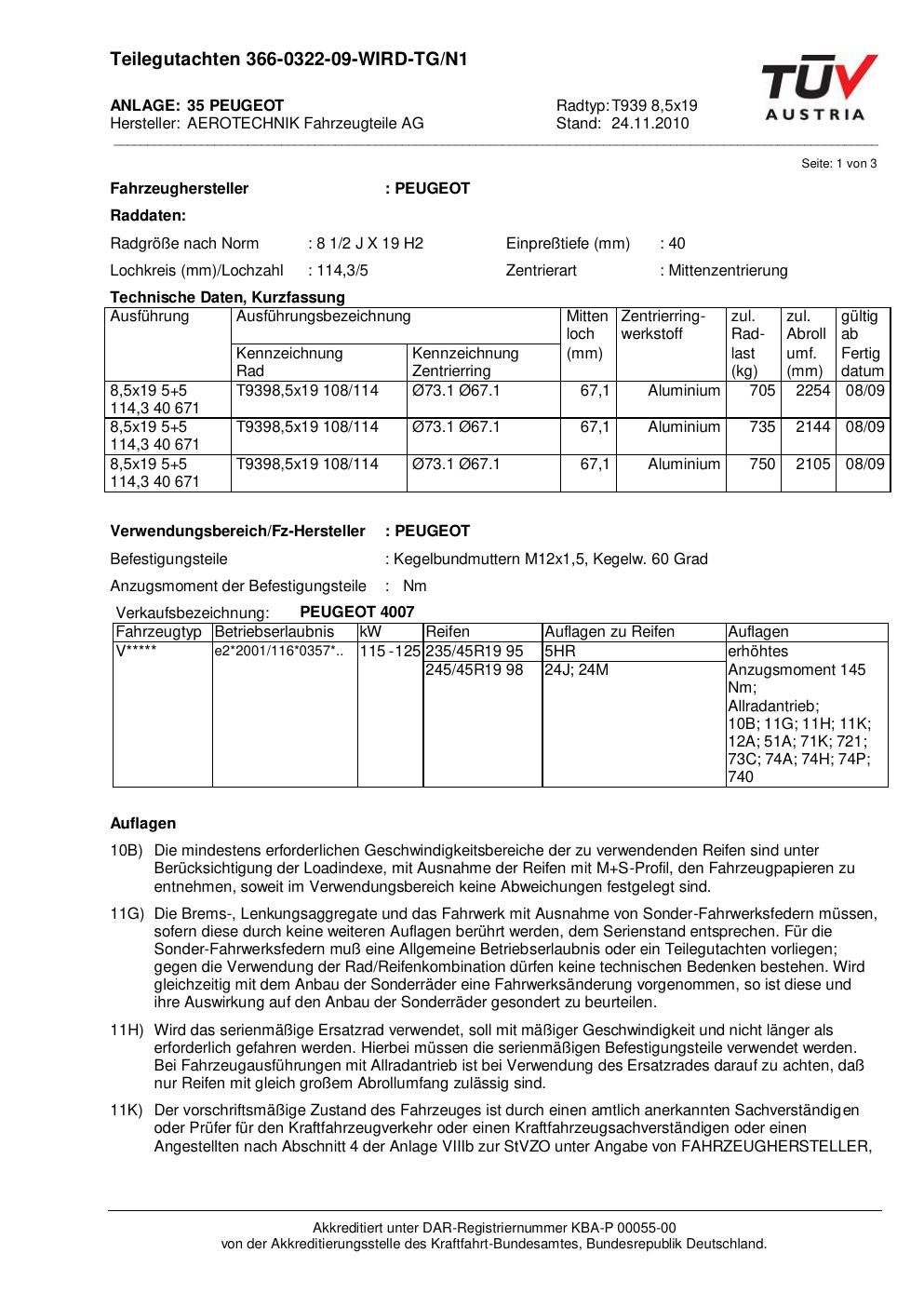 teilegutachten 366-0322-09 AEROTECHNIK T939 8,5x19